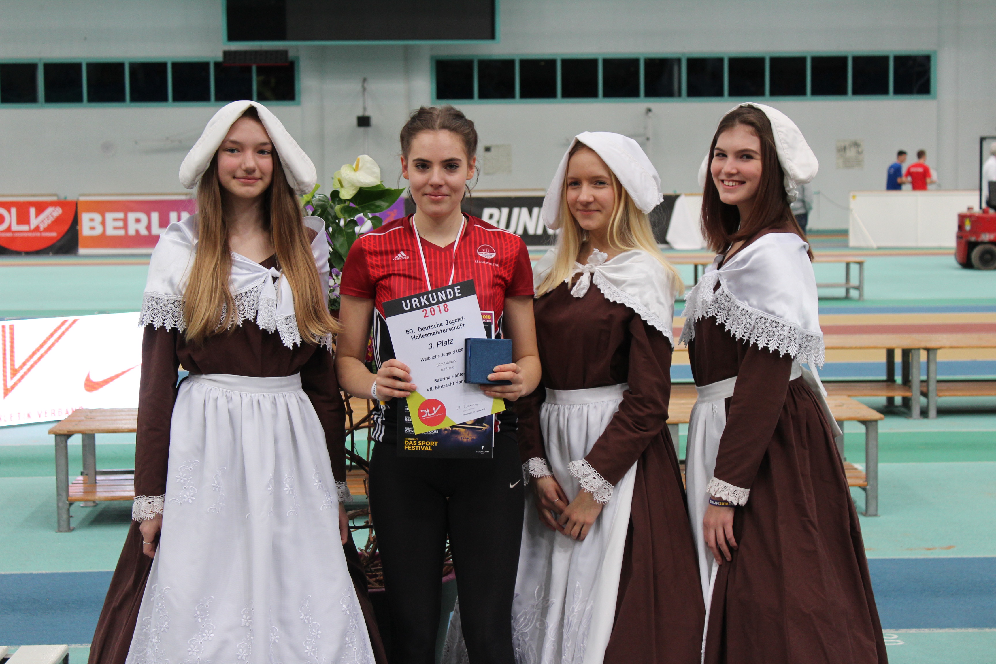 Sabrina Häßler, umrahmt von Hostessen, gewinnt bei den Deutschen Leichtathletik-Jugendhallenmeisterschaft die Bronzemedaille über 60 Meter Hürden und wird für den Hallenländerkampf Deutschland, Frankreich und Italien nominiert. Der Länderkampf findet in Frankreich statt.