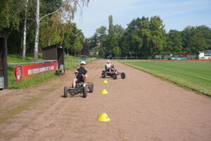 Auf Grund des sehr heißen Wetters wurden die Wasserspiele zur Freude aller vorgezogen. Es konnten sich alle gut abkühlen und spätestens bei der abschließenden Wasserschlacht zwischen den Kindern und unseren BfDlern Joelin und Carlo sowie unserem Azubi Tim war jeder komplett durchnässt. Die Wasserschlacht haben die Kinder übrigens eindeutig gewinnen können. Nachdem die Wasserspiele vorgezogen wurden, wurde am Mittwochvormittag dann der „olympische VfL-Vierkampf“ durchgeführt. Hier haben die Kinder mit tollem Sportsgeist und viel Einsatz beim „Kettcar-Rennen“ super Leistung gezeigt.