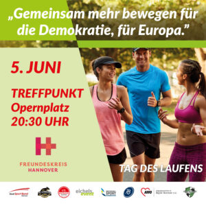Unsere Demokratie und ein friedliches Europa sind die Grundpfeiler unseres Zusammenlebens in Hannover und Niedersachsen. Der Freundeskreis Hannover ruft gemeinsam mit vielen Vereinen am bundesweiten „Tag des Laufens“ auf, um in Bewegung für unser Europa und eine friedliche Demokratie zu demonstrieren. Am Mittwoch, den 5. Juni ab 20.30 Uhr findet „gemeinsam bewegen“ rund um die Oper in Hannovers City statt. „Alle Teilnehmenden bekommen eine Startnummer und können auf dem Rundkurs Laufen, Walken, Gehen, Rollern oder inklusiv mit dem Rollstuhl dabei sein“, hofft Freundeskreis Vorstand Hajo Rosenbrock auf viele Teilnehmende der „gemeinsamen Bewegung“. „Wir wollen damit zur Stimmabgabe bei der Europawahl aufrufen, vor allem viele Erstwähler zum Wahlgang motivieren und bringen den Wert unserer demokratischen Rechte in der gemeinsamen Bewegung zum Ausdruck“, blickt die neue Freundeskreis Kuratoriumssprecherin Stefanie Eichel auf den Europawahltermin am 9. Juni. Unterstützer der Aktion rund um die Oper sind die AWO Hannover, der Stadtsportbund, die Marathonmacher von eichels, die Hannoveraner Breitensportvereine VfL Eintracht und 78, der Hochschulsport, die Handballer der Recken sowie die Basketballerinnen der TKH Luchse. „Eine Anmeldung kann vorab unter www.tagdeslaufens.de/anmeldung erfolgen, für Kurzentschlossene werden Startnummern kostenfrei und unverbindlich vor der Oper ausgegeben.“