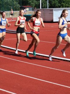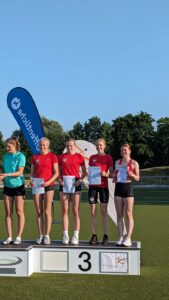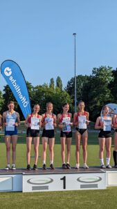 Auch im Hochsprung gab es gleich zwei Podiumsplätze: Der Meistertitel ging hier mit 1,67m an Jelde Jakob. Mehrkämpferin Lea Zybur wurde mit 1,58m Dritte. Einen weiteren dritten Platz konnte Lea sich über die 100m Hürden in 15,71s sichern. Vor ihr erreichte U20-Siebenkämpferin Jeanne Alipoé in einer PB von 15,49s das Ziel und damit Rang 2. Über die 400m Hürden-Distanz ging der dritte Platz in 65,20s an Marlene Stöhr. Im Dreisprung konnte Meret Marie Plesse, die noch der U20 angehört, erstmals die 12m-Marke überspringen, sodass ihre neue PB von 12,01m nicht nur den Silberrang, sondern auch die Qualifikation für die Deutschen Jugendmeisterschaften bedeuteten! Im Weitsprung ging Platz 5 mit 5,34m an Svenja Gilde, Platz 8 mit 5,11m an Vanessa Ahrndt. Im Speerwurf konnte Lena Ullrich ihre PB um fast 3 Meter auf 37,40m steigern und sich selbst mit einem zweiten Platz überraschen. Ebenfalls den zweiten Platz belegte Cathinca van Amerom im Hammerwurf mit 52,06m.