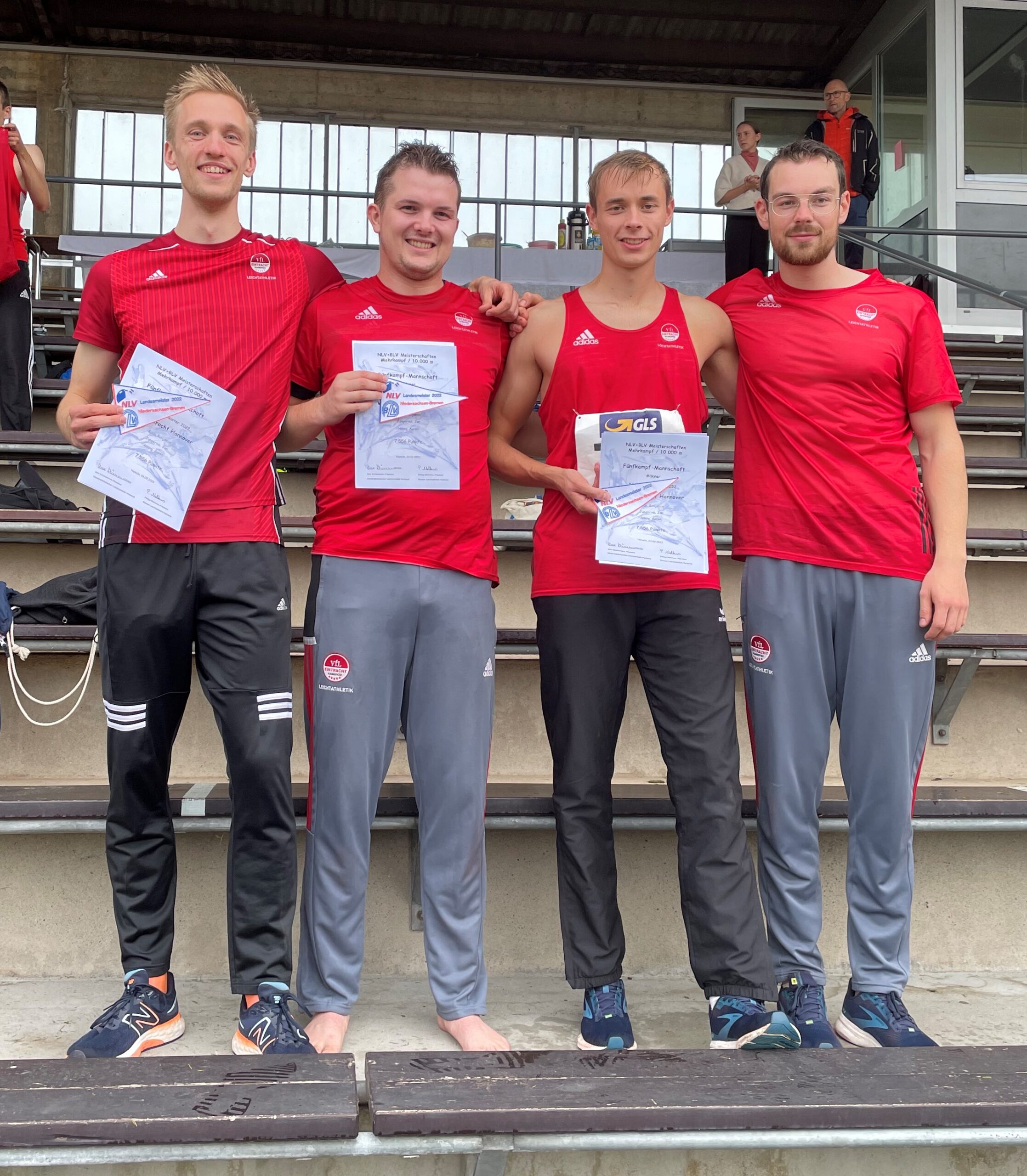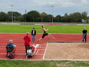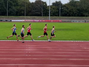 Bei den diesjährigen Landesmeisterschaften im Fünfkampf in Hameln am 24.09.2022 war die Trainingsgruppe von Max Trosien und Hillrich Onnen mit vier Athleten vertreten mit der Zielsetzung nach der im Juli gewonnenen Landes- und Norddeutschen Meisterschaft in der Zehnkampf-Mannschaft nun auch den Landestitel in der Fünfkampf-Mannschaft zu erringen. Benjamin Küch belegte mit 2970 Punkten sowie drei Einzeldisziplinsiegen im Weitsprung (6,53m), über 200m (23,14s) und über 1500m (4:31,88min) den zweiten Platz. Jan Jüngerink konnte als Dritter mit 2527 Punkten und zwei dritten Plätzen in den Einzeldisziplinen Weitsprung (5,97m) und 1500m (4:53,34min) bei seinem Debüt in unserem Vereinstrikot gleich einen Podiumsplatz belegen. Aaron Höing erzielte 2059 Punkten und damit den 10. Platz sowie trotz Schmerzen im Ellenbogen im Speerwurf mit 43,77m die drittbeste Weite der Wertung. Niklas Frank gelangen neue Bestleistungen über 200m, sowie mit Diskus und Speer, sodass er mit 1971 Punkten den 11. Platz belegte.