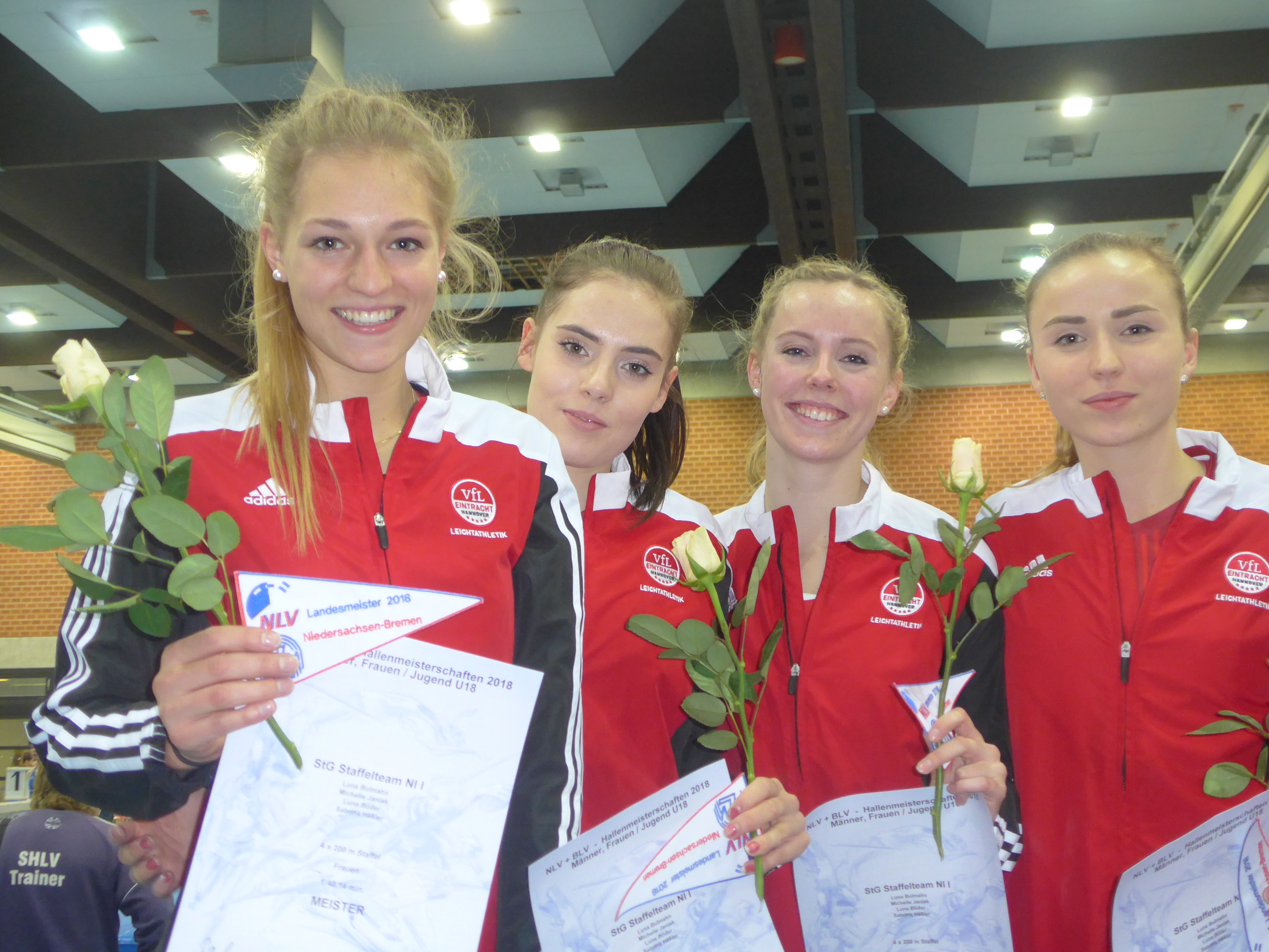 P.H. Herzlichen Glückwunsch zum Titelgewinn und der Nummer Eins in der aktuellen DLV-Hallenbestenliste 2018 4 x 200 Meter Landesmeisterinnen, v. l. Luna Bulmahn, Sabrina Häßler, Luna Böder, Michelle Janiak