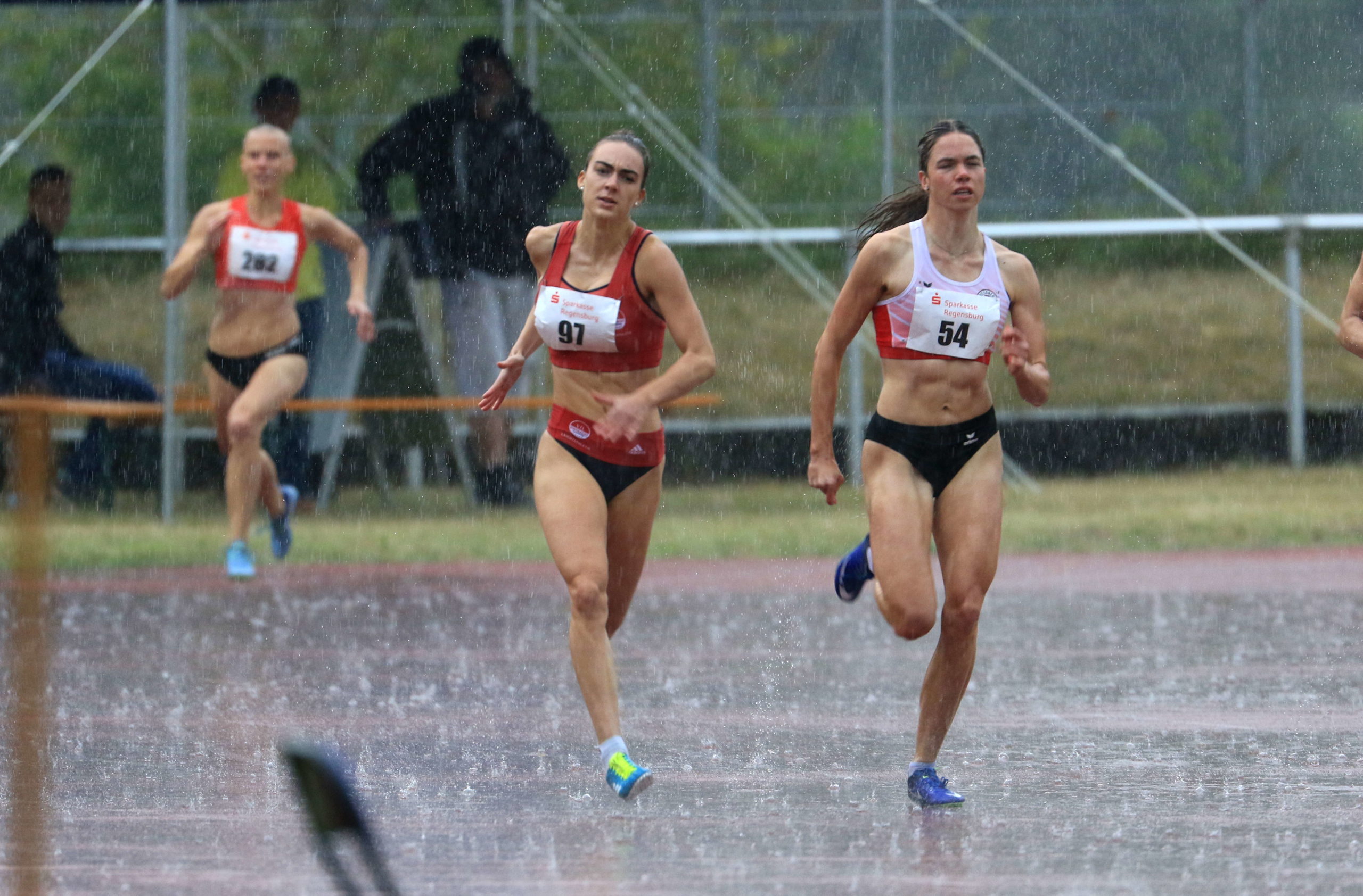 P.H. Bei der Sparkassen Gala in Regensburg starteten Lea Ahrens und Svenja Pape über 400 Meter und erwischten denkbar schlechte Bedingungen. Bei strömenden Regen lief Lea 56,24 Sekunden und Svenja Pape 57,24 Sekunden.