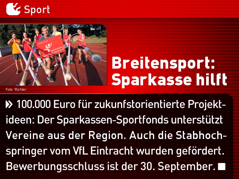F.F Am 15. Und 16. September 2016 präsentierte das Fahrgastfernsehen der „Üstra“ die Trainingsgruppe um Adrian Stender, Jannik Berlipp, Yannick Masur, Trainer Kjell Onnen, Bendix Gerling, Marcus Ziebell und Jasmin Büsel (v. l.). Dank der Unterstützung durch den Sparkassen-Sportfonds konnten speziell für die Jugendlichen endlich (weitere) Trainings- und Wettkampf gerechte Stäbe angeschafft werden.